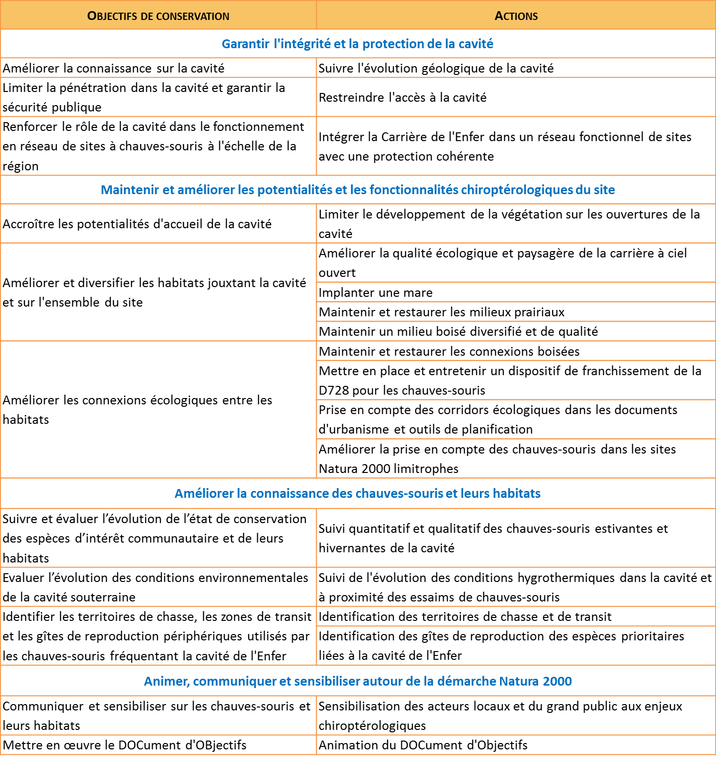 Lors de l'écriture du DOCument d'OBjectifs (DOCOB), de grandes orientations de conservations ont été définies en concertation avec les différents acteurs locaux du territoire. Des actions opérationnelles existent afin d'atteindre chacun de ces objectifs de conservation. Leur contenu vous est proposé ci-dessous.